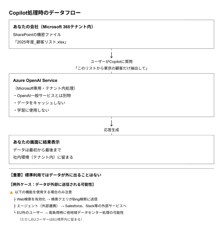 このフロー図が示すように、標準的な使い方ではデータは一度も社外に出ません。処理は完全にMicrosoft 365の「サービス境界内」で完結します。